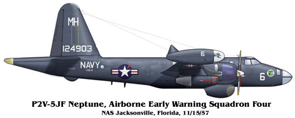 The P2V-5JF was a specially modified Neptune used to penetrate hurricanes. Most of the ASW equipment was removed and new mission specific gear was installed. Some P2V-5J and P2V-5JFs also had an additional radar installed in the clear bow station. This particular Neptune of VW-4, while wearing the overall seaplane gray scheme has had a portion of the engine cowling replaced with one still retaining the previous sea blue color.