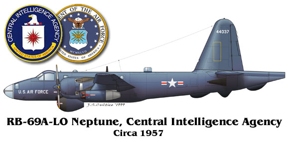 ![]() Delivered to the Central Intelligence Agency over forty-five years ago, the Lockheed RB-69A still remains a closely kept Cold War secret and a little known Skunk Works project. Under the code name PROJECT CHERRY, seven P2V-7s were pulled from the Lockheed production line, given Navy Buaer numbers and accepted by the US Air Force. The aircraft were then modified for it's new mission, most if not all ASW equipment was removed giving way to a variety of sophisticated ELINT systems. Initially flown by Air Force volunteers ultimately assigned to the CIA, they and the foreign pilots hired by the CIA, were given new identities, complete with backgrounds and rehearsed cover stories. Using the USAF as a cover and the proliferation of the Neptune in both US and international service allowed the CIA aircraft to go relatively "unnoticed". In 1956-57, after extensive training, the CIA Neptunes became operational, five aircraft going to the Republic of China (Taiwan) and two going to Wiesbaden Air Base in West Germany. The RB-69As in Germany joined a host of other aircraft gathering intelligence on the nations along the Iron Curtain. The RB-69As used for the Russian missions were often flown by Polish or Czechoslovakian crews, since they were more familiar with eastern Europe terrain and languages. The early missions were a mix of border surveillance and penetration flights into communist airspace, collecting power grid data. The RB-69As were known to have operated from primary bases in Germany, Japan, England, Turkey, Norway and Greece. The European Neptune program was eventually compromised and the Wiesbaden missions were terminated by 1963. The United States and the Republic of China had a long history of joint clandestine efforts against mainland China beginning in 1955 with project HUNTING WOLF. The Neptunes that had previously flown in Europe were sent to Taiwan where they joined those first sent during 1957 to replace the aging B-17s previously used for ELINT work. The RB-69As were loaned to the ROCAF 34th Squadron, 8th Group, operating from Hsinchu Air Base, which also served as U.S. Headquarters for the project. No markings were carried on the ROC Neptunes other than a removable placard on the vertical tail bearing a ROCAF number. Some Neptunes carried four aft-facing AIM-9B "Sidewinder" missiles on wing pylons. The 34th Squadron, nicknamed the "Bats", flew most missions at night, below 1,000 feet. In addition to the ELINT snooping and leaflet drops, the RB-69As flew night missions to drop agents by parachute. Over-flights of communist Chinese territory were routine and comparatively safer than Europe, since China had not yet established a sophisticated SAM defense network. More than 80 penetrations of Chinese airspace were flown from 1958 through the mid 1960s. Missions were also flown over North Vietnam. In time the Mainland Chinese improved their air defenses, which began to take its toll on the small group of Neptunes. From 1961 to 1964, five of the RB-69As were either lost to hostile actions by the Communist Chinese or operational accidents. The last two Neptunes were finally withdrawn from service in 1964-5 and their final disposition is currently unknown. The Profile The RB-69As were delivered in the standard sea blue finish applied to all production Neptunes at the time. The RB-69As wore standard U.S. Air Force markings on the nose and a serial number on the tail. This example is the most "famous" of the RB-69s, the subject of a series of official USAF photographs. Bibliography Lockheed P2V Neptune: An Illustrated History, Wayne Mutza, Schiffer Publishing Ltd. 1996