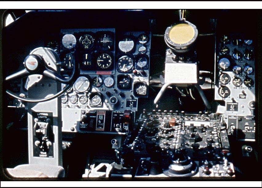 The cockpit. Center console was loaded with radio equipment control units. Actual radios were located in the after station and at the