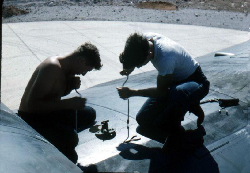 Fuel cell: The two guys working on the wing are opening up the area over the fuel tank. You can see the open fuel cap cover. You have to reach down into that area and remove a rather large fuel cap to refuel. This is just one of the fuel cells. There must have been a leak or some kind of directive which had these guys working in the hot sun in Crete.
