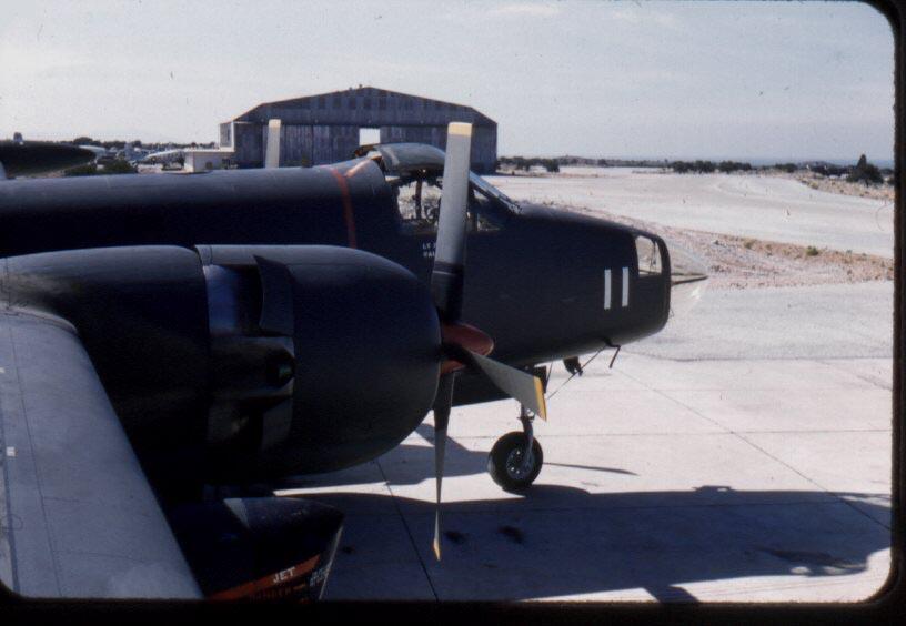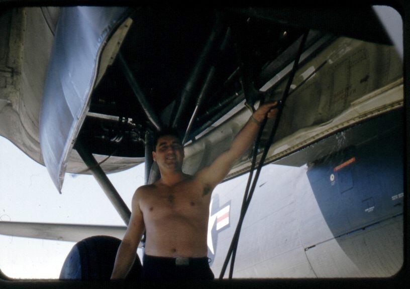 My friend Robert Wood, at the time Aviation Ordinance man, first class, retired as a Chief Petty Officer. Woody would help out by cleaning the wheel wells as he is doing here. Yes, that is raw avgas dripping down off the landing gear door. There is a sump drain within the wheel well, and he would hook up a rubber hose with a small pipe, as pictured and clean out all the grease and oil from the wheel wells. You can get an idea of the size of these things by his size. Woody stood about 6 ft and went about 190 lbs. In order to access the generators and the back of the engine, one could put a step ladder in there and get up behind the engine to check the