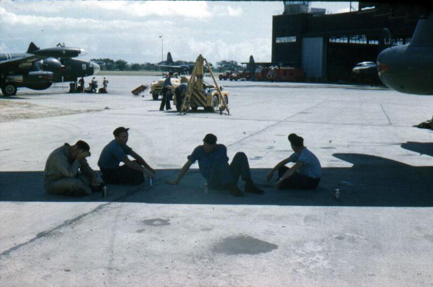 attached into the bombay with bomb shackles. Also note how everyone tends to congregate under the wing. As a crewmember, you learn early on that the wing can offer some protection from the hot sun as well as a drenching rain. This was important when you had to work around outside the aircraft. If the rain got too bad, we would hide out in the airplane until it was over. Sometimes, if we were on the ramp too long in a heavy rain, I would try to get into the bunk which is located over the